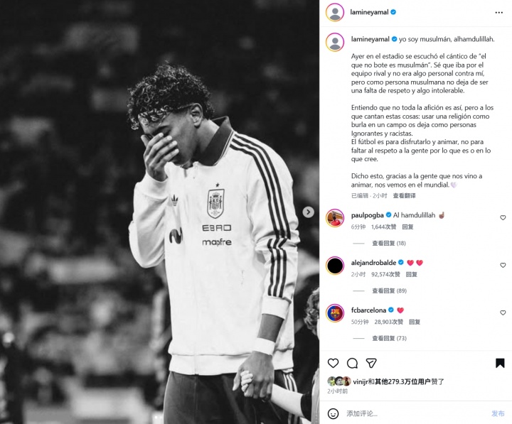亚马尔发声谴责:我是穆斯林 足球是来享受的 不是侮辱攻击他人的
